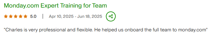 “As a company, we loved working with Charlie. He was very responsive and he is truly a Monday CRM expert. On the rare occasion where he could not answer our questions, he was able do to a bit of research and get back to us quickly. Charlie has excellent people skills. He was able to work with our entire team, both individually and as a group. We highly recommend Charlie and will continue to work with him”